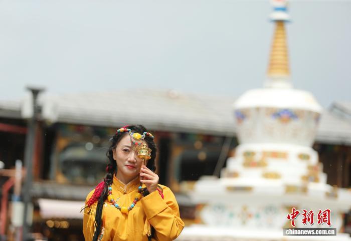 8月15日,一名游客身著藏裝打卡獨克宗古城。中新社記者 黃興鴻 攝