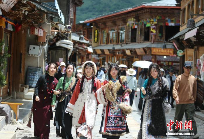 8月15日,游客身著藏裝游覽獨克宗古城。中新社記者 黃興鴻 攝