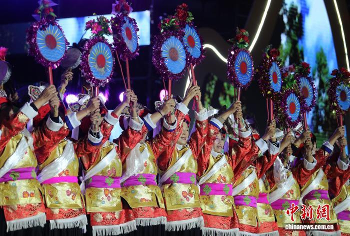 9月27日晚,迪慶州香格里拉市代表隊表演舞蹈《阿卡巴拉》。中新社記者 黃興鴻 攝