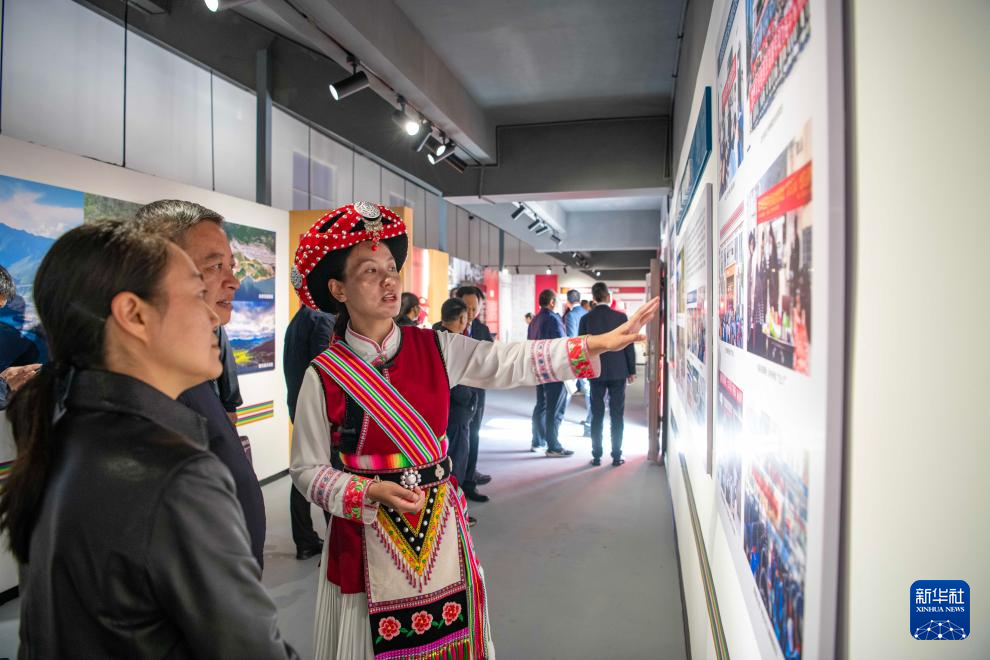 10月13日,游客參觀云南省迪慶藏族自治州維西傈僳族自治縣發(fā)展成就圖片展。新華社 李建生 攝