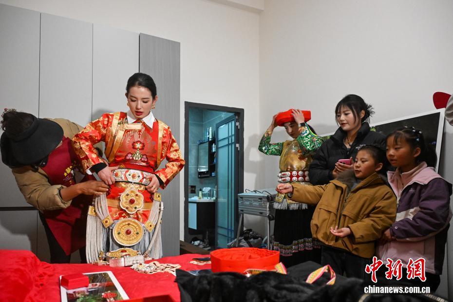 圖為好友為扎史永宗穿戴傳統(tǒng)藏式婚服。中新社記者 李嘉嫻 攝