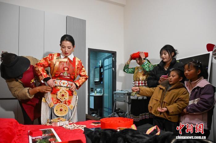1月24日,婚禮迎來(lái)高潮。清晨,永宗早早開(kāi)始梳妝打扮,在親人的幫助下穿上傳統(tǒng)藏裝,佩戴嘎烏盒、腰帶等配飾。配飾上的一顆顆紅珊瑚,比金銀裝飾更加耀眼?!斑@些配飾是從我婆婆的婆婆傳到我這一代的?!庇雷诮榻B。