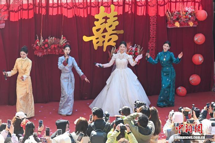 小型舞臺(tái)上,司儀用普通話、藏語(yǔ)、云南方言講述著新人的愛(ài)情故事。永宗與培楚換上西式禮服登臺(tái)致謝。隨后,舞臺(tái)成為歡樂(lè)的海洋。永宗身著婚紗與3位女同事深情獻(xiàn)唱,幾位帥氣藏族小伙組成“男團(tuán)”,跳起熱門(mén)網(wǎng)絡(luò)舞蹈,引得現(xiàn)場(chǎng)尖叫連連。老一輩也不甘示弱,登臺(tái)帶來(lái)藏族民歌、弦子演奏等精彩節(jié)目,將婚禮變成“小型演唱會(huì)”。