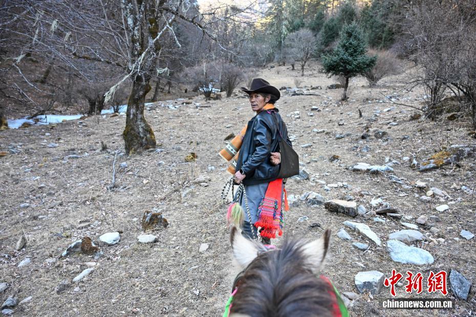 圖為1月27日,丹增培楚行走在山間,不時(shí)回頭張望后面有沒有掉隊(duì)的騾馬。中新社記者 李嘉嫻 攝