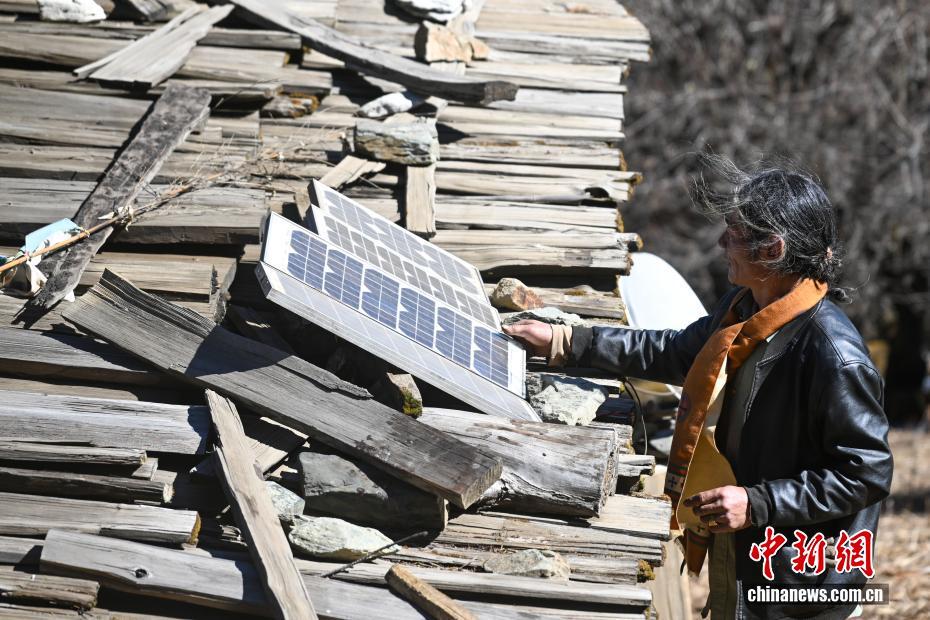 圖為1月27日,丹增培楚正在擺弄小木屋頂?shù)奶?yáng)能板。中新社記者 李嘉嫻 攝