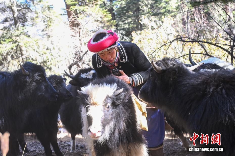 圖為1月27日,七林央宗在照看牦牛的同時(shí)用對(duì)講機(jī)與丈夫聊天。中新社記者 李嘉嫻 攝