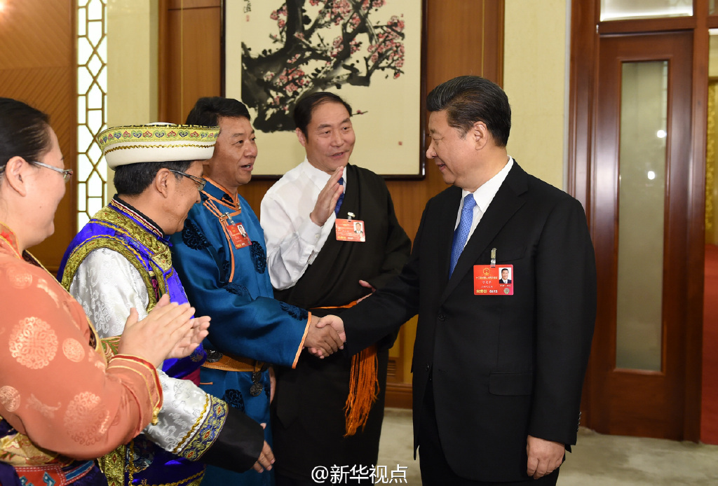 10日上午,習(xí)近平來到青海代表團(tuán)參加審議。當(dāng)總書記走進(jìn)會(huì)場(chǎng)時(shí),藏族、蒙古族、土族3位代表分別向總書記獻(xiàn)上潔白的哈達(dá),表達(dá)對(duì)黨中央和總書記的敬意。習(xí)近平請(qǐng)他們轉(zhuǎn)達(dá)對(duì)各族人民的祝福。審議中,幾位少數(shù)民族代表就民族團(tuán)結(jié)進(jìn)步、促進(jìn)城鄉(xiāng)教育公平、實(shí)施精準(zhǔn)扶貧等發(fā)言。習(xí)近平不時(shí)詢問具體情況,強(qiáng)調(diào)多民族是我國(guó)一大特色,是我國(guó)發(fā)展的一大有利因素。要著力增強(qiáng)民族地區(qū)自我發(fā)展能力和可持續(xù)發(fā)展能力,尊重民族差異、包容文化多樣,讓各民族在中華民族大家庭中手足相親、守望相助、團(tuán)結(jié)和睦、共同發(fā)展。