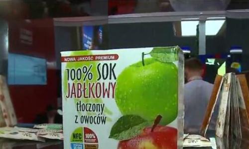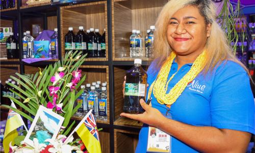 11月6日,太平洋島國展區(qū)紐埃展臺的工作人員推介諾麗果汁。