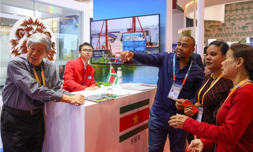 11月6日,加勒比地區(qū)國家展區(qū)蘇里南展臺的工作人員(右三)向參觀者進行推介。
