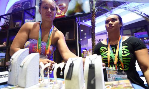 11月6日,太平洋島國展區(qū)庫克群島展臺的工作人員在擺放黑珍珠飾品。