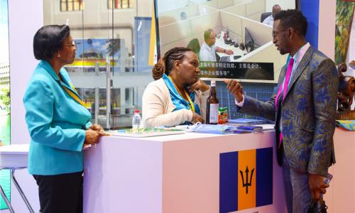 11月6日,加勒比地區(qū)國家展區(qū)巴巴多斯展臺的工作人員(中)與參觀者交談。