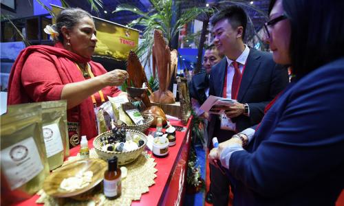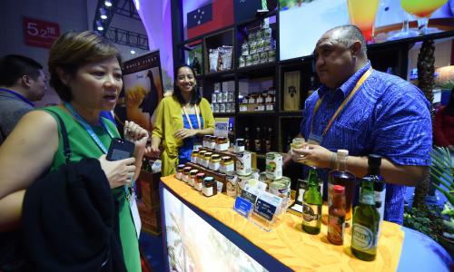 11月6日,太平洋島國展區(qū)薩摩亞展臺的工作人員向參觀者進行推介。