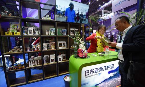 11月6日,太平洋島國展區(qū)巴布亞新幾內(nèi)亞展臺的工作人員向參觀者進行推介。