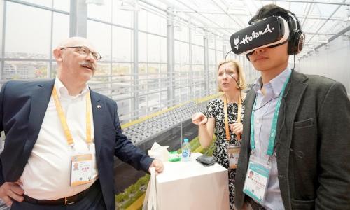 11月6日,一名參觀者在荷蘭展區(qū)體驗虛擬現(xiàn)實設(shè)備。