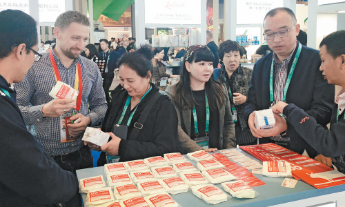 11月6日,太平洋島國展區(qū)湯加展臺的工作人員(左)向參觀者介紹展出的食品。