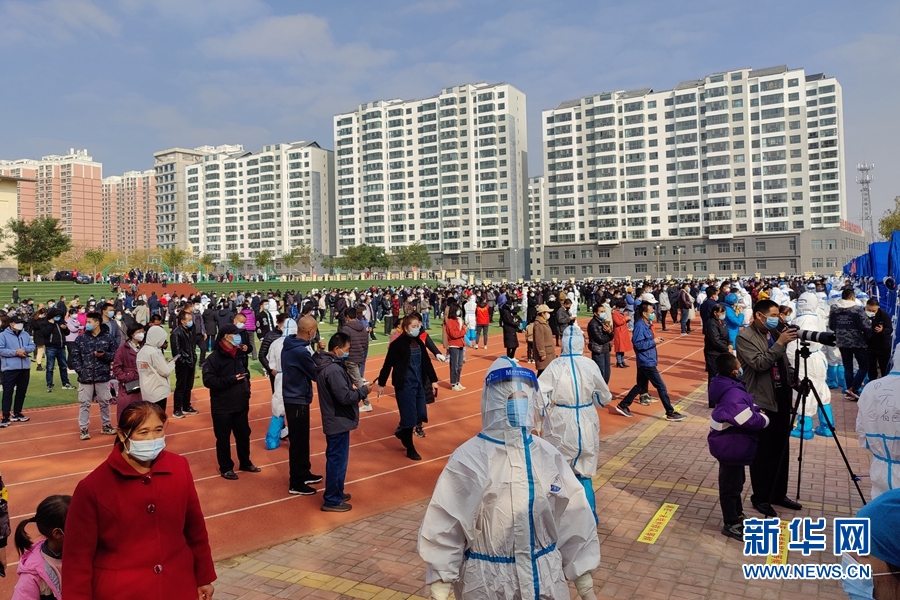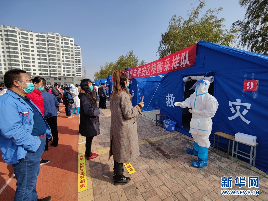 海東市平安區(qū)核酸檢測點平安小學里等候檢測的人員井然有序。新華網(wǎng)發(fā)(朱建軍 攝)