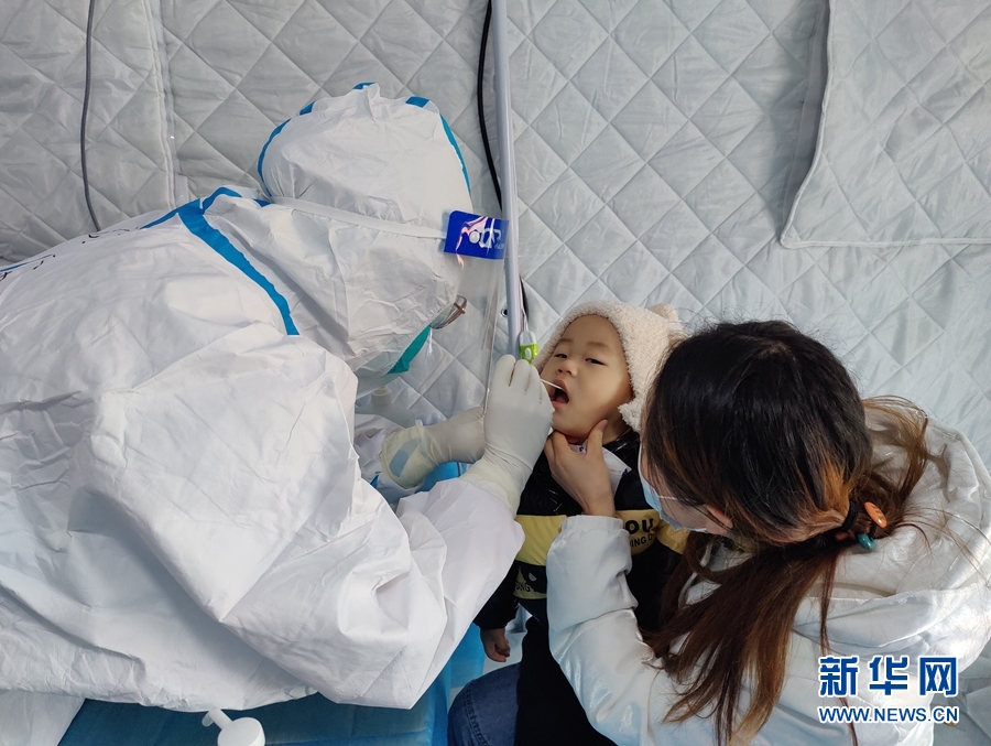 青海省人民醫(yī)院醫(yī)務人員為平安區(qū)幼兒進行核酸采集。新華網(wǎng)發(fā) (朱建軍 攝)
