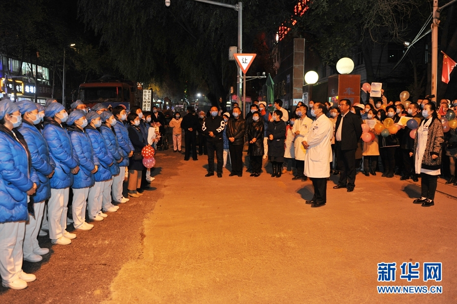 10月24日,青海省人民醫(yī)院職工在醫(yī)院大門前等待返程醫(yī)療隊員。新華網(wǎng)發(fā)(朱建軍 攝)