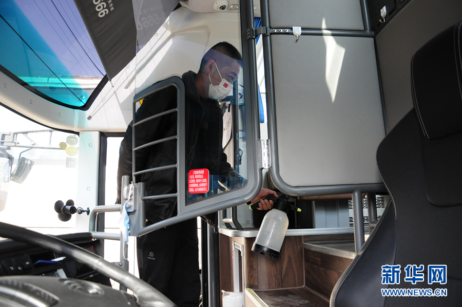 袁孝兵在用消毒液擦拭客車扶手。新華社記者 王浡 攝