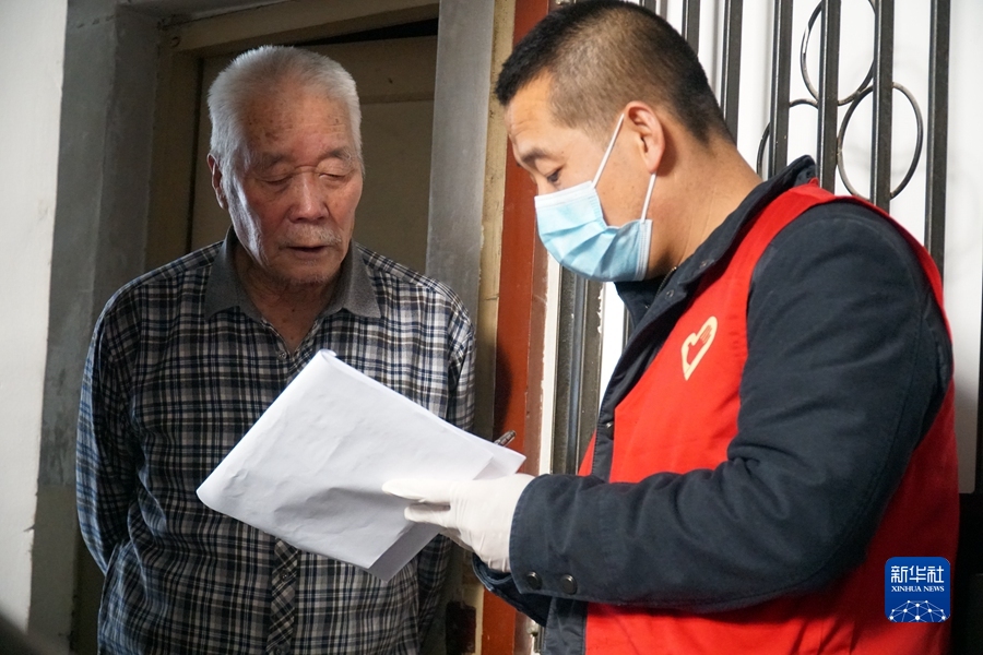 11月1日,在青海省西寧市城西區(qū)勝利路街道西交通巷社區(qū),志愿者入戶排查居民信息。(新華社記者 張子琪 攝)