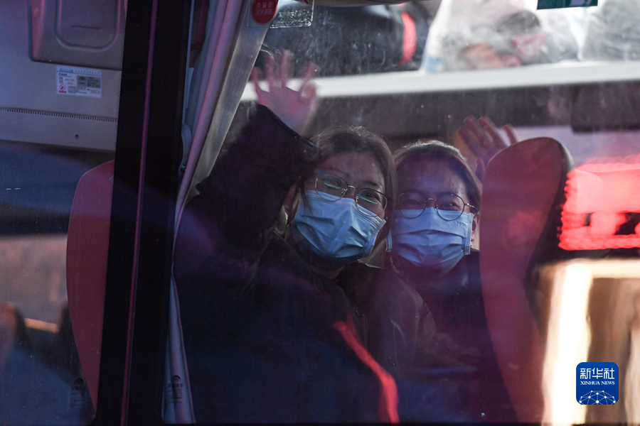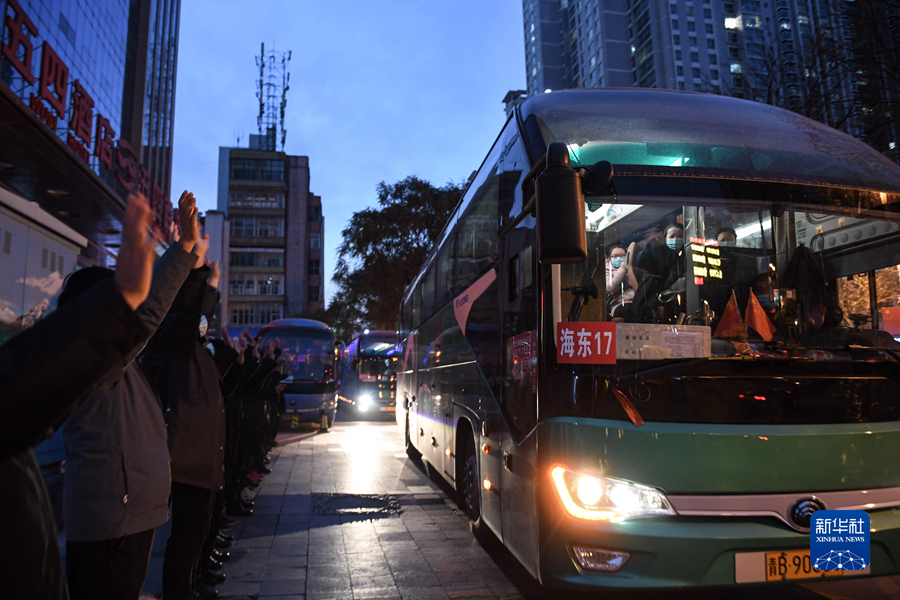 10日,海東支援西寧醫(yī)療隊(duì)隊(duì)員乘車離開西寧。(新華社記者 吳剛 攝)