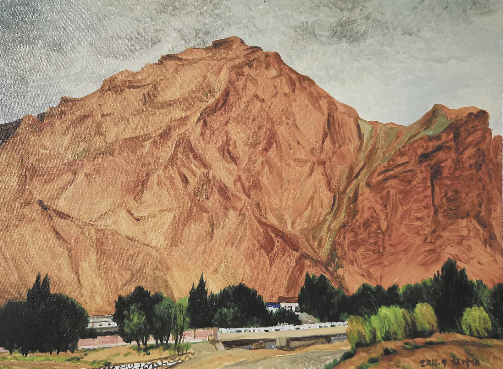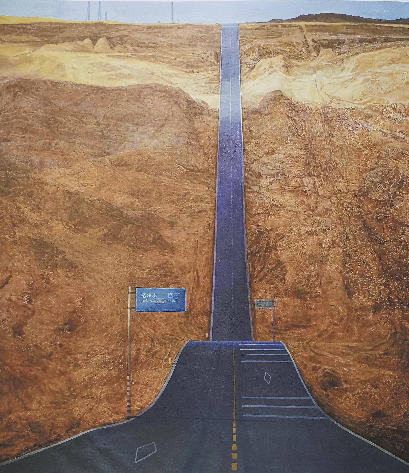 青海巴顏喀拉雪峰巍峨而壯麗、博大又神秘。王輝筆下的油畫作品《巴顏喀拉雪峰》采用寬闊的筆觸在畫布上建構起壯麗的“雪山”景象,在接近幾何化的寫意性藝術形式建構中,塑造出寧靜的青海高原雪山意境和黃河源頭的神秘與博大。青海同仁縣是“天下黃河——中國百名油畫家主題作品展”前期活動在青海的首站,也是各地畫家對青海留下深刻印象的一個地方。袁文彬的油畫作品《黃河隆務峽》,描繪的就是黃河蜿蜒、澤被高原的青海同仁。畫面中黃河兩岸沃野連綿、青山入云,畫家以明凈的色彩展現(xiàn)出天藍藍、云連綿的青海自然生態(tài)氣象,以及黃河沾溉之地的壯美富饒之境。位于青海貴德的國家地質(zhì)公園阿什貢,其自然景區(qū)內(nèi)丹霞地貌廣闊、水網(wǎng)交織,是黃河上游青海境內(nèi)典型的高原地質(zhì)地貌,獨具自然生態(tài)魅力,畫家林增偉以敏銳的藝術感知,創(chuàng)作完成了油畫作品《黃河上游阿什貢》。其明亮的色彩基調(diào)和寫實的造形方法,在畫面中營造出了潔凈的陽光和空氣,生動展現(xiàn)出黃河上游阿什貢的明凈氣象與無塵色彩。李智詠的油畫作品《格爾木的路牌》則從一個獨特的觀看視角,在“紀念碑式”的新穎構圖形式中,描摹出了青海省海西蒙古族藏族自治州格爾木市的一條網(wǎng)紅公路——315國道U型公路。這條公路是連接青海省會西寧與格爾木的重要交通要道,因為其路面隨著地勢高低起伏,仿佛是躍動著伸向蒼穹的天路一樣,因此也被稱為“中國版66號公路”。在這幅繪畫作品中我們能夠看到,筆直的公路直指天際,莊嚴又神秘,清晰的路牌印證與展示出新時代青海高原交通和旅游發(fā)展的蓬勃生機,繪畫作品體現(xiàn)出畫家對青海經(jīng)濟社會發(fā)展的深情關注,傳遞出其真切的高原藝術情感。