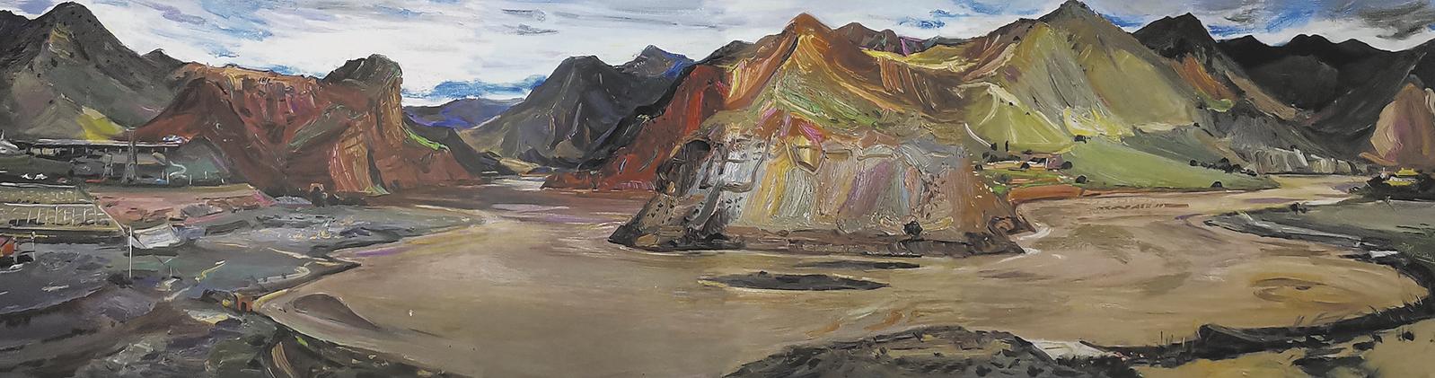 中國美術家協(xié)會主席范迪安是展覽的總策劃人,也是前期組織畫家沿黃河進行寫生活動的發(fā)起人,他的油畫作品《李家峽水庫》,描繪了位于青海尖扎縣和化隆回族自治縣交界處,黃河干流李家峽水庫的水文地貌和水利工程景象,畫家創(chuàng)新性地采用了中國傳統(tǒng)“長卷繪畫”藝術的圖像呈現(xiàn)方式,來展開當代油畫藝術的空間敘事,運用寫意性的繪畫造形手法,描繪出黃河上游李家峽水庫水電站工程的宏大場景。畫面中作為主體繪畫對象的水庫大壩,占據(jù)作品近景中心位置,形成畫面的視覺藝術焦點,凸顯出李家峽水庫水電站的偉大工程壯舉。同時,畫家在青海寫生過程中也曾講到:“黃河流域的視覺圖景包括了改革開放以來治理黃河的成果,特別是新時代以來黃河流域在生產(chǎn)和生態(tài)兩方面的新成果。”《李家峽水庫》繪畫作品中山河輝映、氣象壯美,反映出畫家對青海美好生態(tài)景象的敏銳捕捉和真情描繪,他們用繪畫作品深情描繪和展現(xiàn)出新時代青海沿黃兒女對母親河——黃河上游自然生態(tài)資源的精心保護、參與開發(fā)和建設,以及綜合利用的現(xiàn)實景象和大美之境。