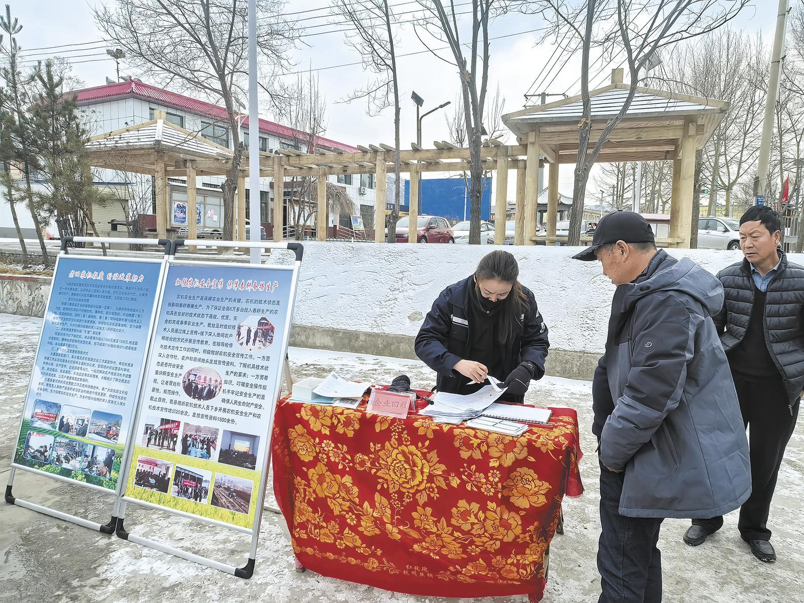 工作人員正在檢修春耕用的大型農(nóng)機(jī)。