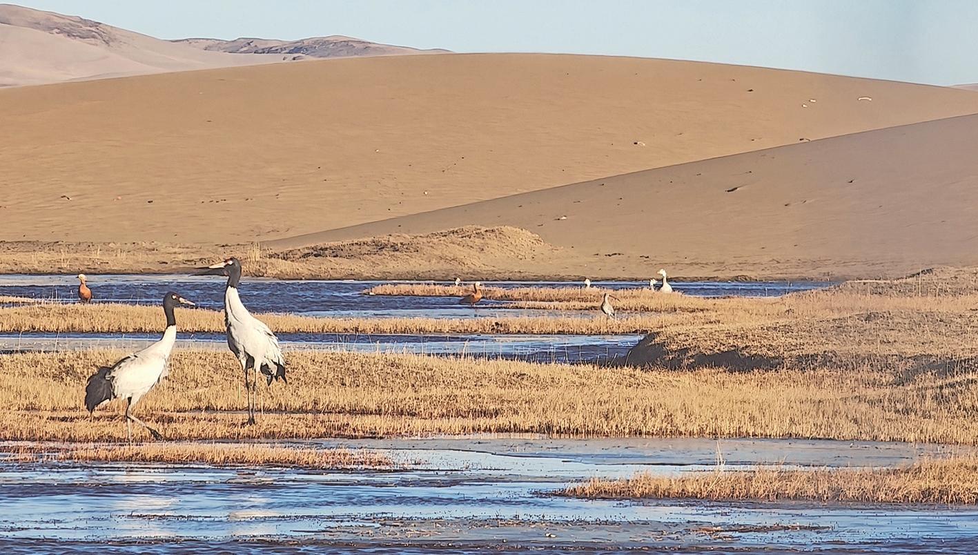 近年來(lái),在瑪多縣黃河鄉(xiāng)生態(tài)管護(hù)員的努力下,當(dāng)?shù)氐暮陬i鶴孵化率從起初的20%提升到了今年的95%以上,成活率也明顯提升。去年秋季,黃河鄉(xiāng)曾監(jiān)測(cè)到400多只黑頸鶴集結(jié)遷徙的壯觀場(chǎng)面,黃河源頭成為三江源地區(qū)重要的黑頸鶴夏季繁殖地。