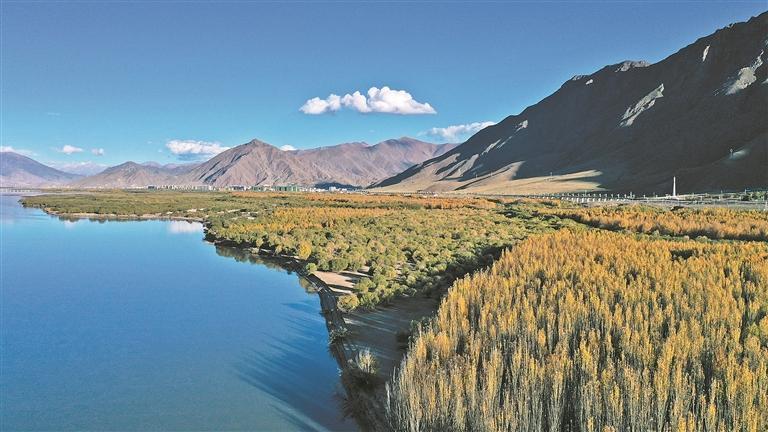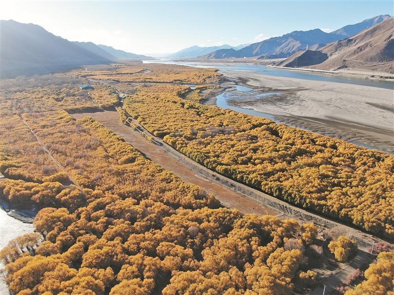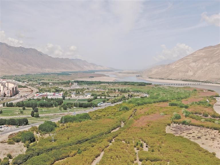 臨近山南市區(qū)的雅魯藏布江沿岸綠意蔥蘢的人造林(資料圖片)。 西藏日?qǐng)?bào)記者 巴桑旺姆 攝