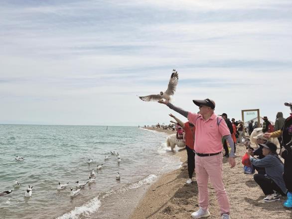 青海湖畔,游客與水鳥互動。