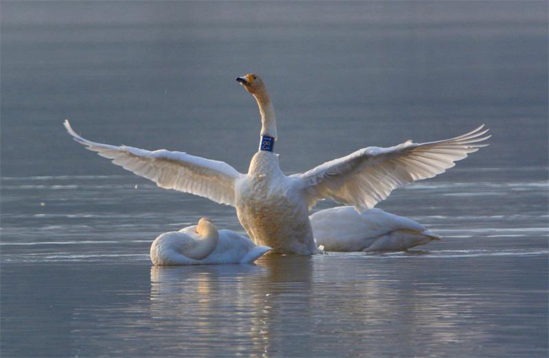 據(jù)了解,這片水域?qū)俟畭{庫區(qū)群科黃河段,2016年開始天鵝頻頻現(xiàn)身,每逢入冬就如約而至,這片水域便被當?shù)厝朔Q為“天鵝湖”,每年來這里越冬的天鵝已經(jīng)從最初的十幾只增加到了一百余只。為了保護“天鵝湖”的生態(tài)環(huán)境持續(xù)向好,化隆縣林業(yè)和草原局積極安排部署,不斷加強保護天鵝宣傳與巡查力度,提醒廣大群眾愛護野生動物、文明觀賞、不要驚擾遷徙天鵝,確保天鵝安全。
