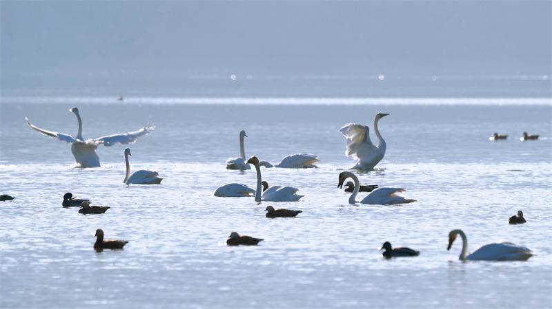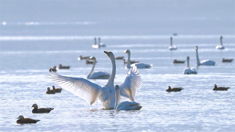平靜的水面上,山光水色融為一體,潔白的天鵝似水中仙子,時而裊裊亭立,時而優(yōu)雅游弋,忽而游走,蕩起圈圈波紋……近日,青海省海東市化隆回族自治縣群科鎮(zhèn)安達其哈村的“天鵝湖”里,又多了許多前來越冬的大天鵝,優(yōu)雅的大天鵝、美好的生態(tài)環(huán)境、前來拍照的游客,成為冬日里化隆縣人與自然和諧共生的美麗風景線。