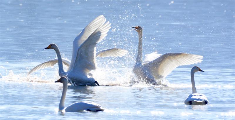 天鵝在水中翩翩起舞。李玉峰攝