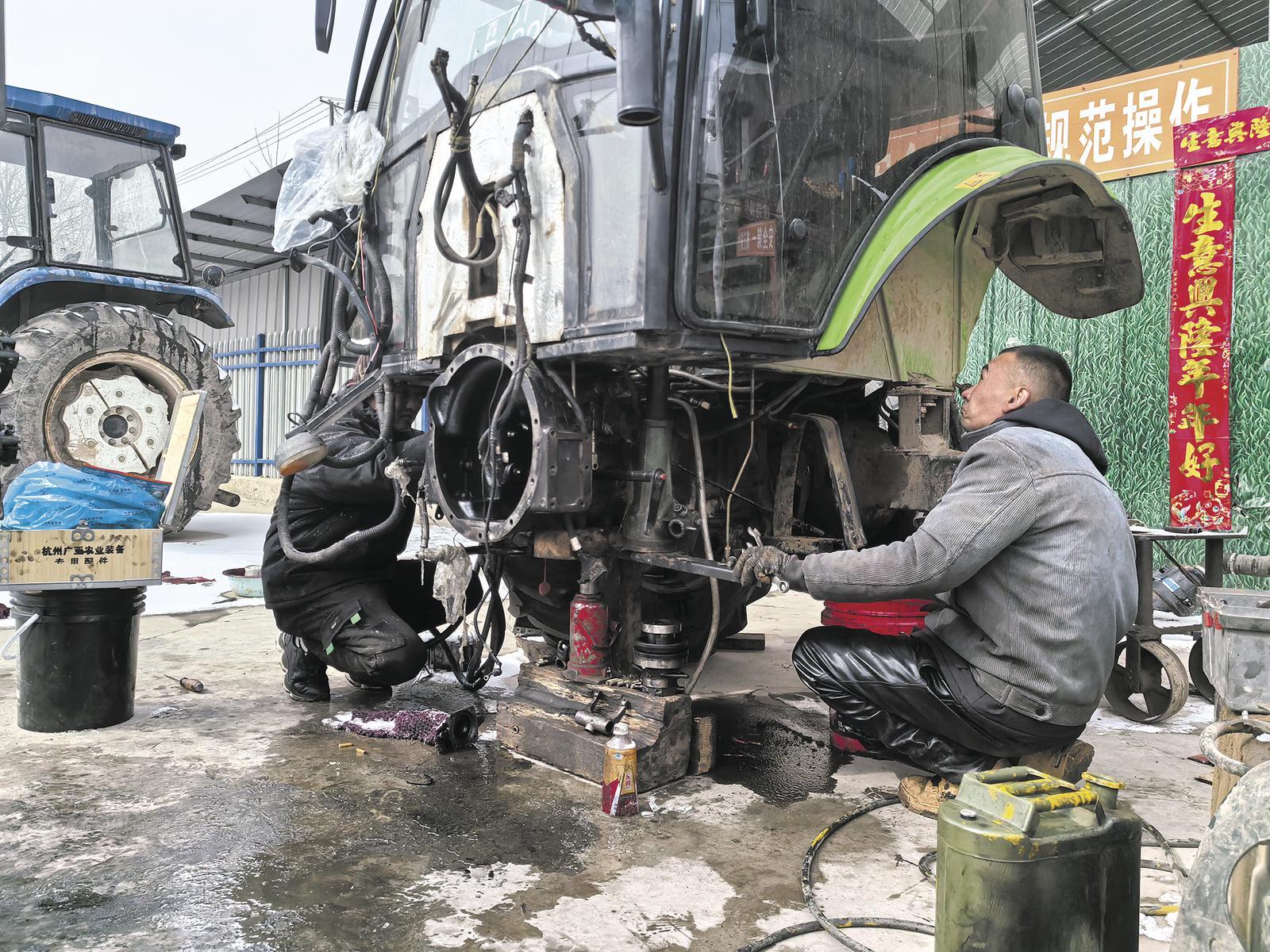 工作人員正在檢修春耕用的大型農(nóng)機(jī)。