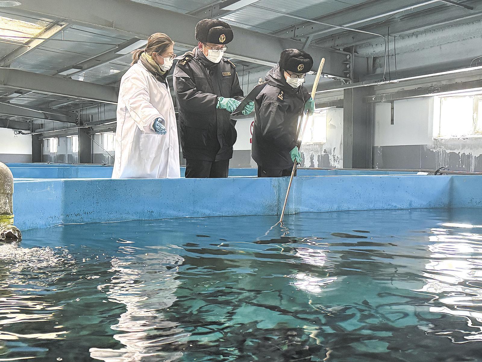 西寧海關(guān)所屬西海海關(guān)關(guān)員對出口虹鱒魚開展監(jiān)管作業(yè)。西寧海關(guān)供圖