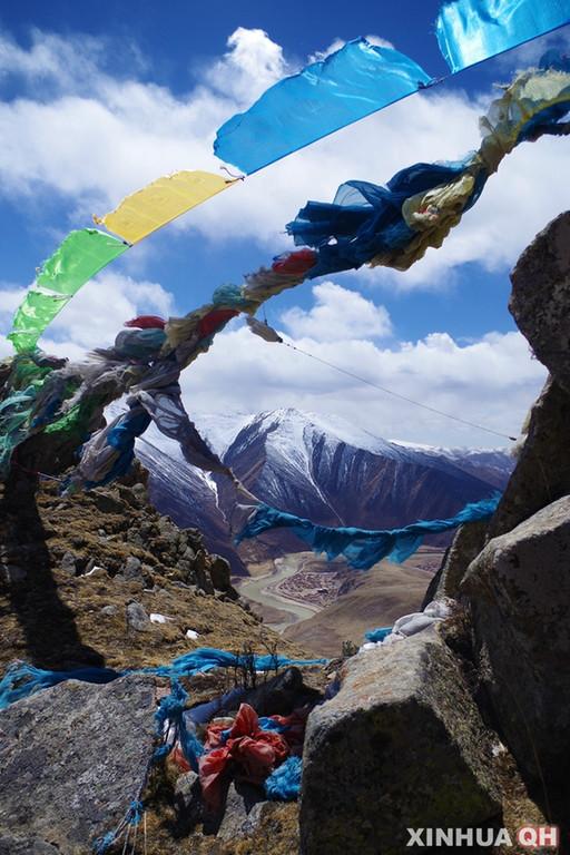 這是4月6日在青海省甘德縣班瑪仁脫山上拍攝的瑪尼堆和經(jīng)幡。