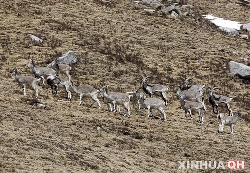 這是4月6日在青海省甘德縣班瑪仁脫山上拍攝的石羊群。?