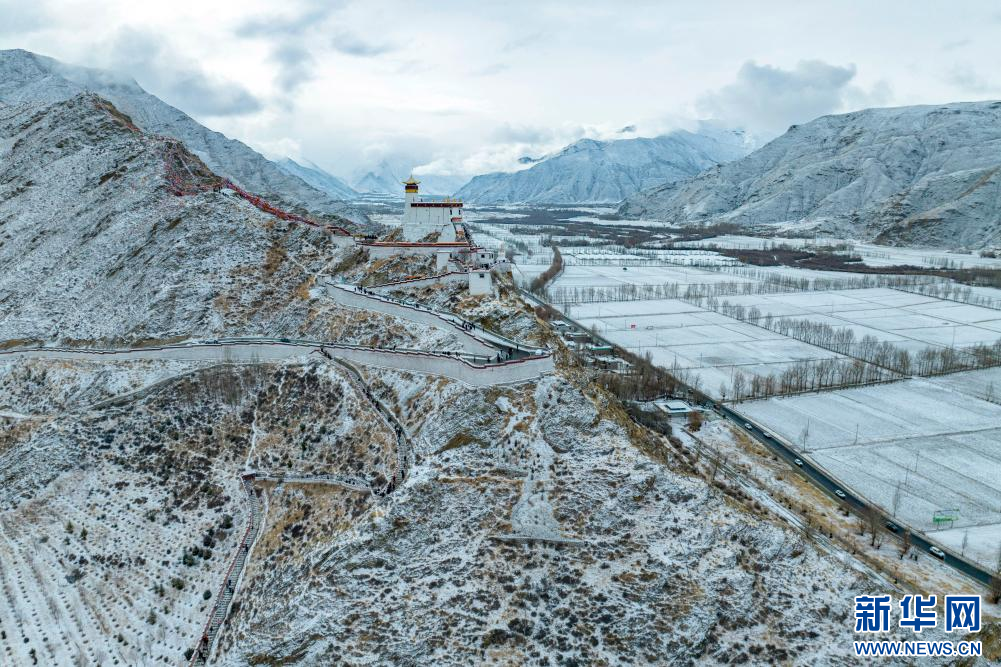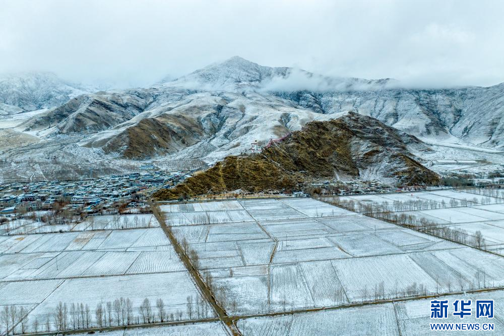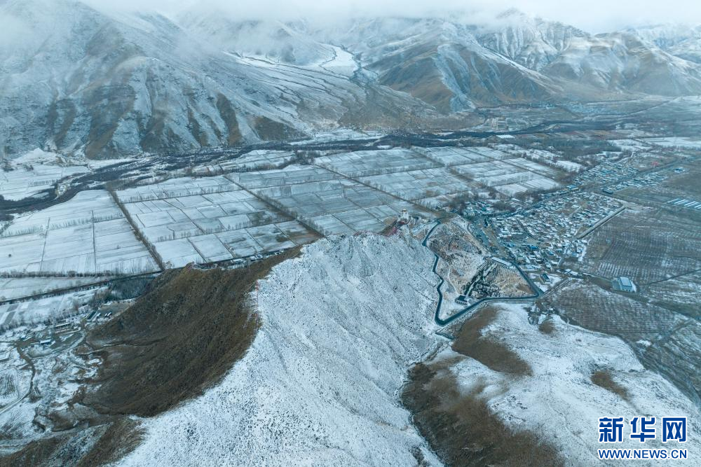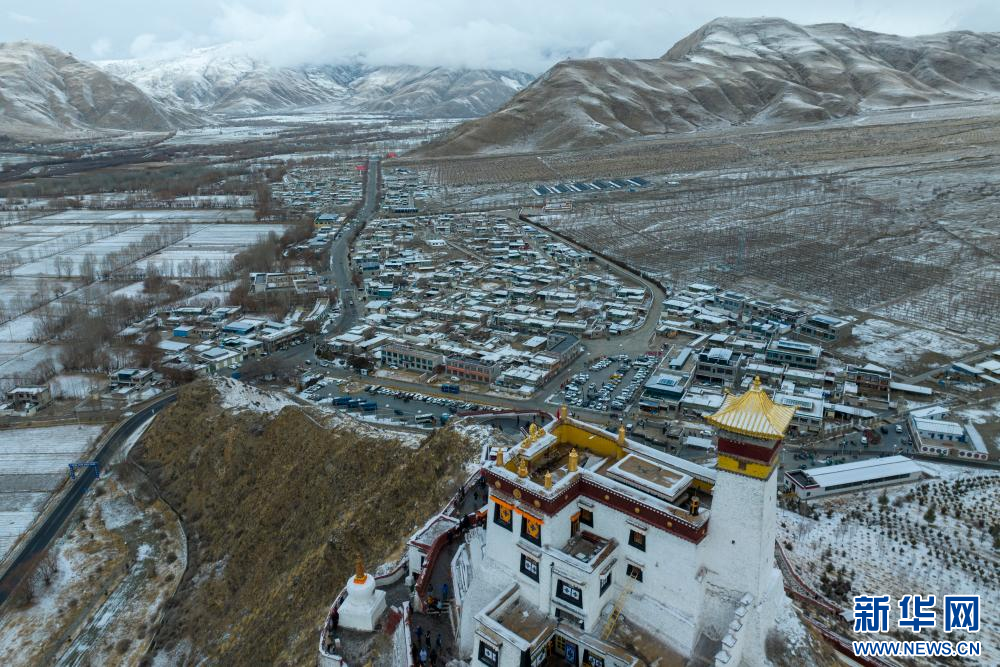 2月15日拍攝的雪后雍布拉康和山腳下的村莊(無人機照片)。新華網(wǎng) 旦增努布 攝