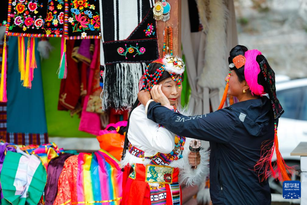 3月23日,在丹巴縣甲居藏寨,游客(左)換上藏族服飾準(zhǔn)備拍照。新華社記者 沈伯韓 攝