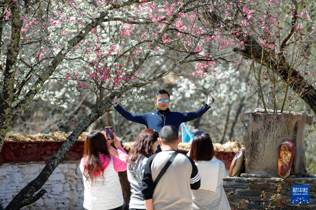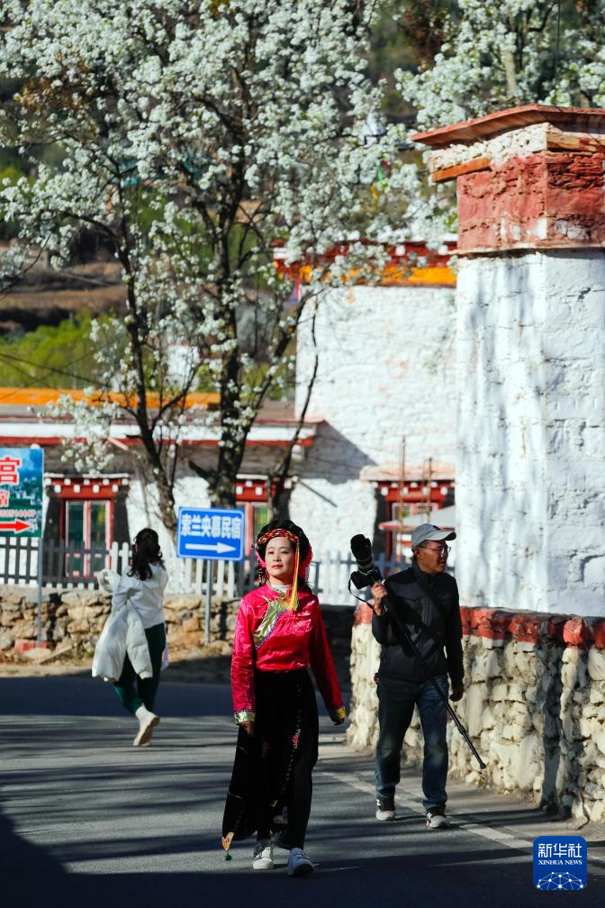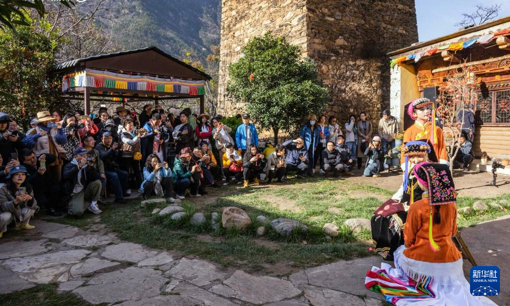 “花開丹巴·為梨而來”2024美人谷·丹巴梨花春賞季活動在丹巴縣中路藏寨開啟,游人在觀賞拍攝嘉絨藏族民俗風(fēng)情展示(3月21日攝)。新華社發(fā)(何曦攝)
