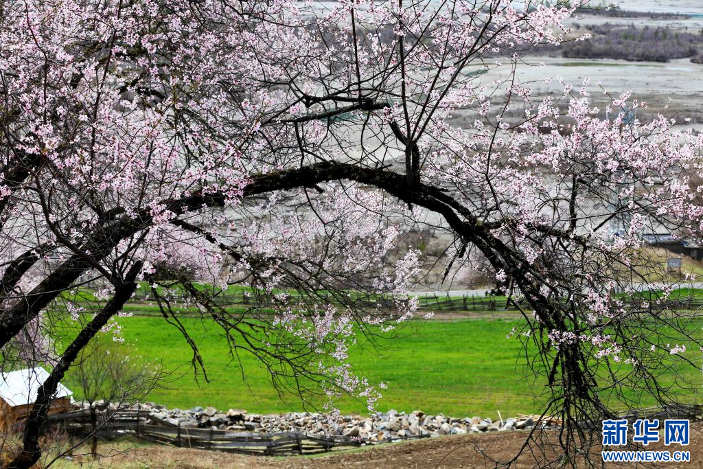 圖為西藏波密縣傾多鎮(zhèn)巴康村內,桃花映襯下的綠草。新華網(wǎng)發(fā) 阿旺仁青 攝