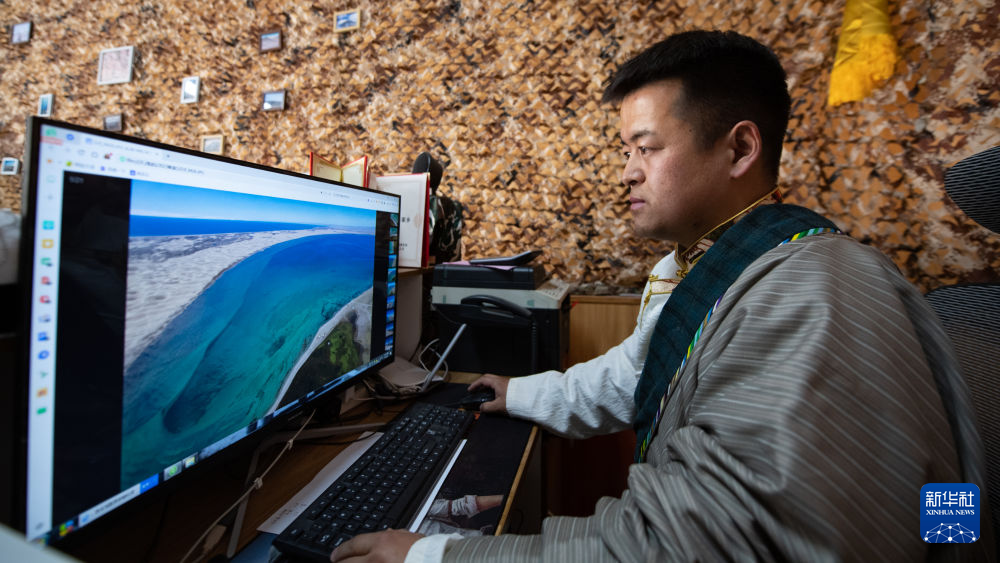 青海省海北藏族自治州剛察縣牧民多杰在挑選照片(4月3日攝)。新華社 潘彬彬 攝