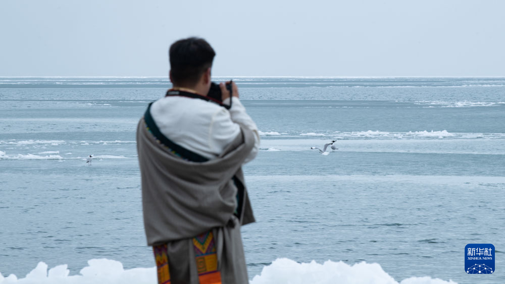 青海省海北藏族自治州剛察縣牧民多杰觀察青海湖開湖情況(4月3日攝)。新華社 王浡 攝