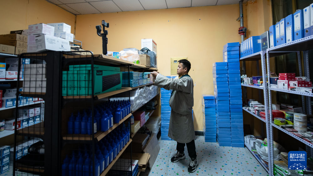 青海省海北藏族自治州剛察縣牧民多杰在自家的小店內(nèi)整理貨架(4月3日攝)。新華社 王浡 攝