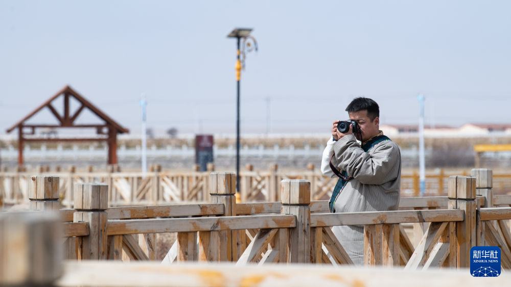 青海省海北藏族自治州剛察縣牧民多杰在剛察縣湟魚家園景區(qū)拍攝(4月3日攝)。新華社 王浡 攝