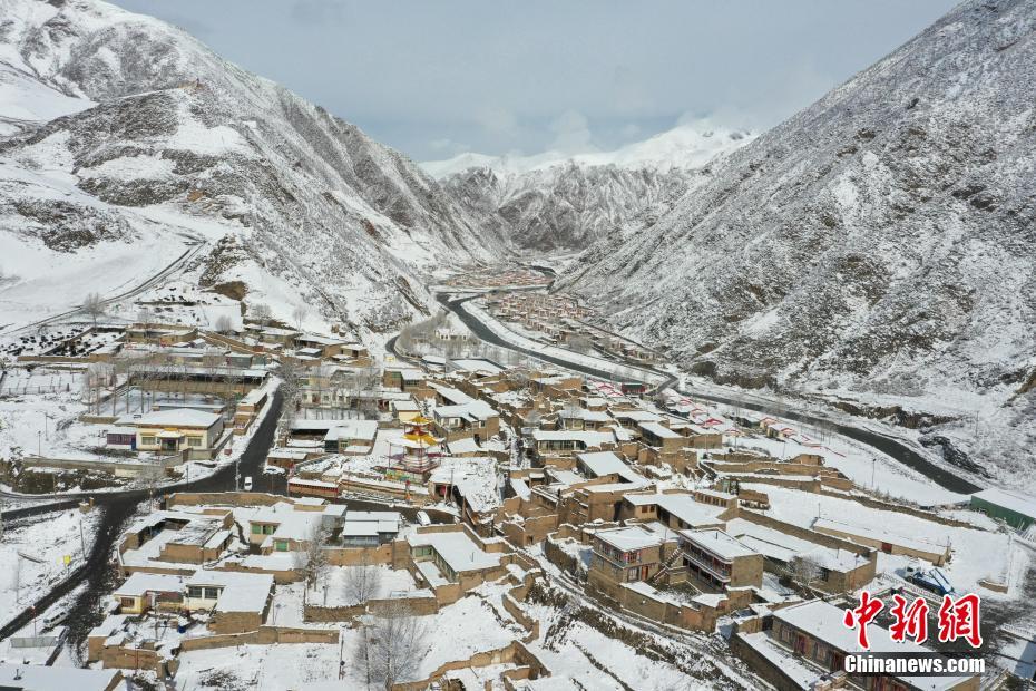 4月10日,航拍青海省玉樹藏族自治州壯美雪景。日前,青海省玉樹藏族自治州降下春雪,連綿的山巒被積雪點(diǎn)綴,與河流、山莊相映成趣,宛如一幅幅水墨畫卷,盡顯山河壯麗。