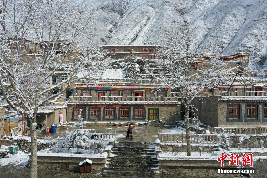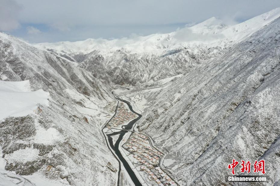 航拍降雪后的青海省玉樹藏族自治州玉樹市益曲卡山莊。馬銘言 攝