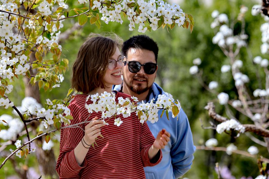 圖為游客在盛開的梨花下拍照留念。新華網(wǎng) 黃開森 攝