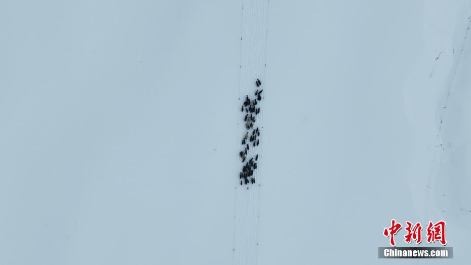 圖為牛羊在雪地里行走。都蘭融媒 供圖